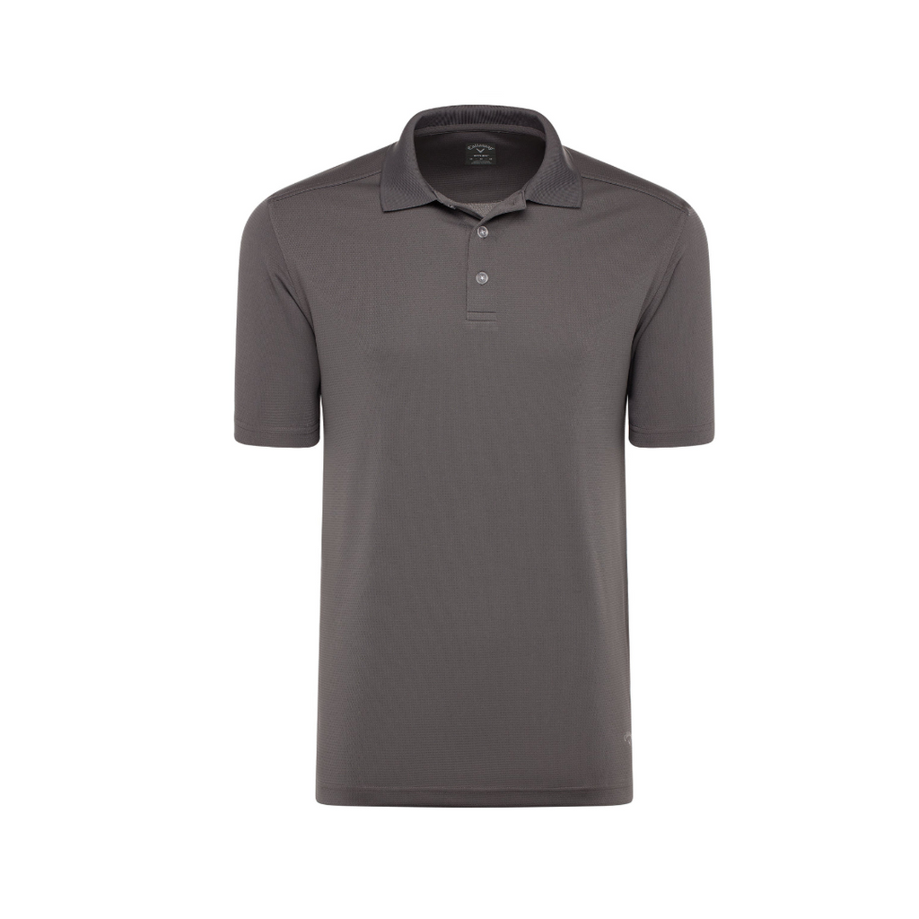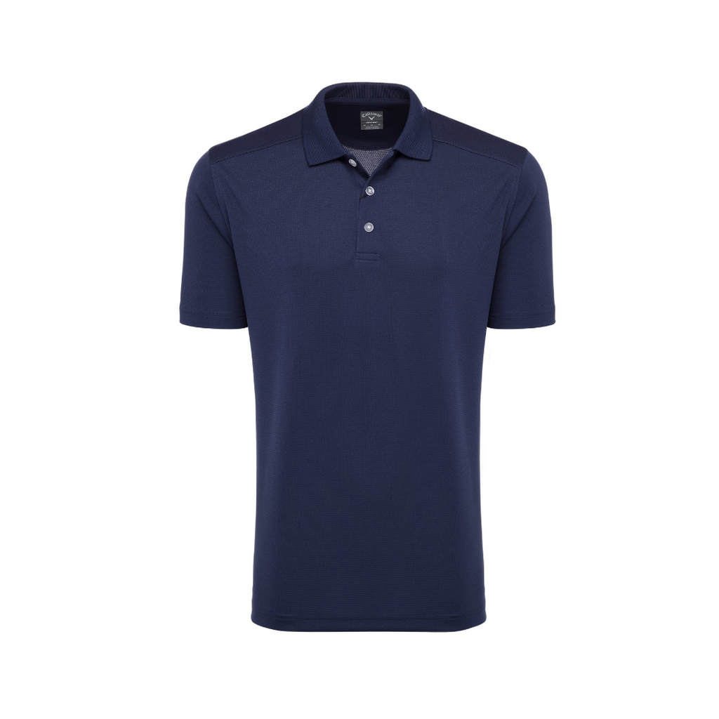 5.6 oz 100% polyester double knit mesh fabric. Opti-Dri technology transfers moisture away from the body to keep you cool and dry. 3-button placket with Callaway embossed buttons. Rib knit collar and open sleeve. Double needle hemmed bottom with side vents